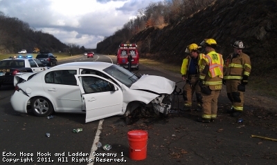 At approximately 11:00hrs companies 1 and 3 were dispatched to Route 8 Northbound between exits 12 and 13 for a motor vehicle accident with injuries. Upon arrival Engine 2 found a single vehicle in the right lane with heavy damage. The driver was able to self extricate with the assistance of Shelton FD and EMS. Patient was transported by Echo Hose Ambulance with minor injuries.